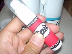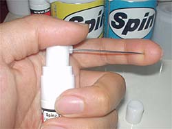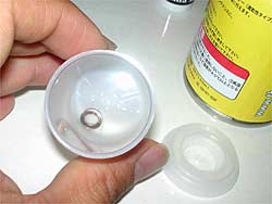 ノズル付きのキャップに付け替えますが、差し込んだとき溶液がでないように、ノズルの先を指で押さえておくと楽です。