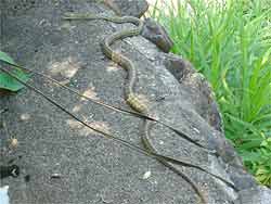 入渓用のコンクリートの塀を歩いていくと、いました今年初のヘビちゃん(シマヘビ)。気持ちの準備ができてなかったのでちょっと腰が引き気味になってしまいました。