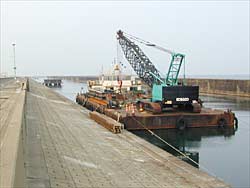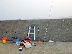 海側に水面1mくらいにライトが置ける段(4mくらい下に)があるのでライトをひもで降ろして集魚するとバッチリです。竿置きがあると良いのですがどういうものが良いのかは研究中です。投げ竿は投げ釣り用を使用していますが、ミャク釣り用が・・・?。