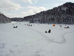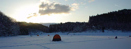 周りではワカサギを1匹釣った人が最高でした。今年は、駄目でしょうね。(私は一度だけワカサギらしいアタリがあったのですが、すぐバスが追いかけ回しているようでした)