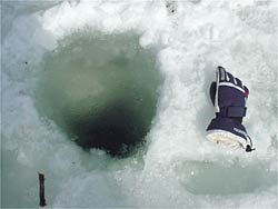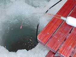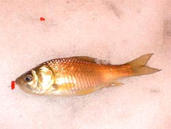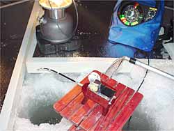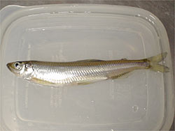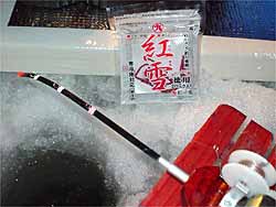 はてさて、なんともワカサギを発見できない釣りで、11時半に撤収。釣果は4匹(10-11cm)。水深4.7m(水温:表面4.6度、2m・4.4度、底・4.8度)。棚は、2mラインで1匹、底で3匹。仕掛け袖バリ号・底バリ付き6本。オモリS。餌、赤白サシ半切りと「紅雪」。