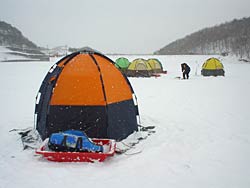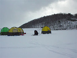 ここは、人気が高く、7時半到着しましたが平日でも駐車スペースはいっぱいになっています。今日は11m水深のところに入ってみました。ここは、ようやく全面結氷ですがまだ一部薄いところがあるそうです。