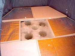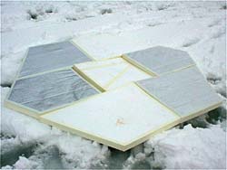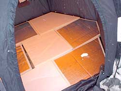 さて、これが今回投入の床です。5cm厚の発泡スチロール製で暖かく、水が上がった氷上でも快適でした。・・が、一枚氷ではなく雪で波打った氷上では、強度不足で割れてしまいました。少し補強や工夫が必要ですね。(改良しないと)床作り