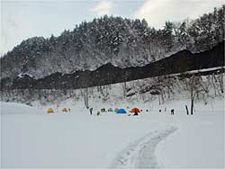 氷は、底に5cmの堅いところと、その上20cmは雪氷、その上に新雪20cmくらい。雪の重みで水が浮いていますのでチャプチャプ状態です。また後家穴も多いのでカンジキがあると良いです。