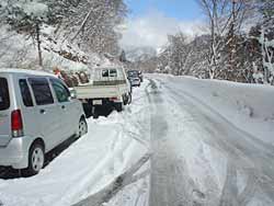 クルマの数は30台程度でしょうか。幅出しされているので寄せて止めれば大丈夫です。(対向車が来るとちょっと辛いけど) 頭の向きを変えるときは、少し先まで行くと路肩まで除雪されたところがあります。