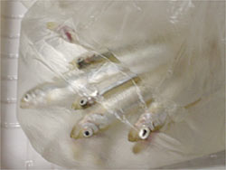 さて釣果は、21匹。水深約5m。棚はベタ底。サイズは5-6cmまでで5cm多数。針は細地袖2.5号の5本針、オモリSS。エサは白サシ半切り。ほぼ落とせばいる状態。しかし、周囲はアタリもないと言ってましたので、おそらくアタリが出せていないようです。穂先を1cmほど軽く振る誘いが有効でした。