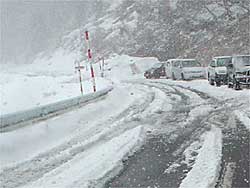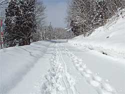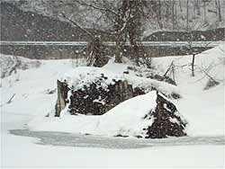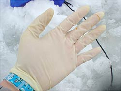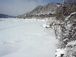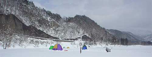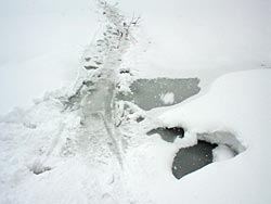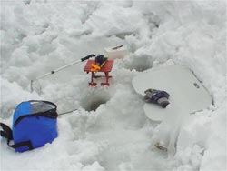 友人に挨拶して、釣果を聞くと相変わらずの水窪サイズだがそこそこ釣れているようでした。氷は表面に5cmくらいの堅い層、その下に雪氷が25cmで底に氷が10cmの40cm強。乗れさえすれば、結構安心です。