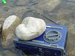 すると、オトリがすんなりポイントかなと思う方に泳いでいくと「ガツン!」一発です。一気にアドレナリンも上昇し、取り込みの手順を考えながら慌てているとウェーダーに引っかかり、掛かったアユは、さようなら、ついでにオトリも機嫌を損ねます。