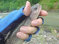 しばらく探っていると、25cmの岩魚です。水深20cmでゲット。同じポイントで17cmも追加してみますが。後が続かず小さいヤマメのみでリリースサイズ。