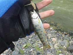 こんなやつがバンバン釣れるのですがもう少し大きくなってね。少し下流も様子見に行きましたがここも小ヤマメのみが爆釣。