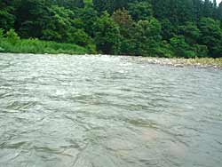 かなり増水して、濁っていますが、重いオモリで浅瀬を狙って釣ります。流さない釣りなので変な感じです。