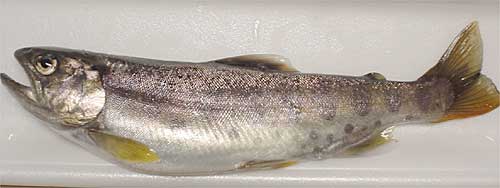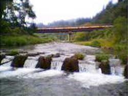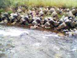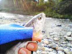 ようやく堰堤でオモリを3Bにして一匹ゲット。(24cmのヤマメ)お持ち帰りサイズなのでキープして下ります。9時過ぎ暑くなり今日はここまでということで終了。