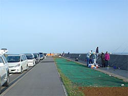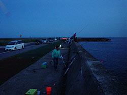 さて、夕方に山形釣り情報のSATO氏と落ち合って、一路酒田へ。今日は、風も強くなく、雨の心配がない絶好の釣り日和です。(昨年は、海はすべて雨でした) しかし、波はやや高く2mとのこと。アジはサビキにウキを付けての陸っぱりの釣りです。