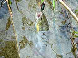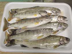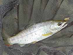 ここは6つの池があって岩魚池、ヤマメ池、ニジマス・・・鯉池などがあります。この池はエサ釣りのみです。天気も悪いためか貸し切り状態で、受付のおばちゃんから釣れなかったら、放すからというありがたいお言葉を頂き、岩魚池でスタートです。しかし、・・・釣れない。魚影も確認できない。仕方がないのでヤマメ池に転進。ようやくニジマス(!?)ゲット。(池同士を行き来しているのか)