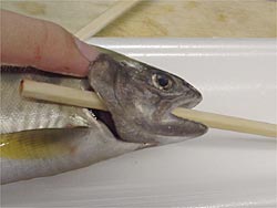 2本の割り箸を一緒に内臓とエラを挟むようにしながら捻りながら、引き抜きます。