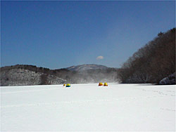 湖の様子が分からないので、少しずつ歩いては穴開けてフラッシャーで覗き、仕掛を降ろすけど数回あたりがあっただけでのせられず、高圧線の南側まで歩いてみました。なかなか良いロケーションで気に入りましたね。