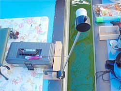 今回、手繰りで勝負するため、クラブクレストのフィッシング・グルーブ(滑車のたぐい)を使ってみました。なかなかかっこいいのでいい感じです。途中バレが確実に減りえさ付けも楽になります。