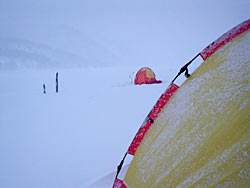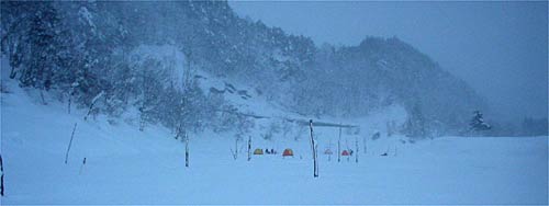 ようやく明るくなってきたので、6時半で終了。何と膝まで雪が積もっています。