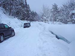 夕方に現場入りですが、13号から曲がると轍の一本道・・前からクルマが来ないことを祈ります。駐車スペースまで来るとようやくUターンができ、一安心。しかし、緩むと動けなくなりそうです。