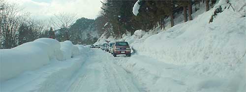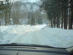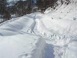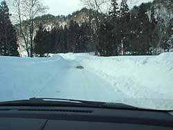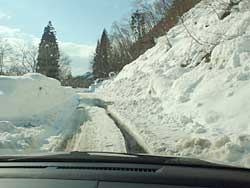 左の写真は、13号から曲がったすぐで1台半分がきれいに除雪されています。(高速の橋桁工事の場所まで)
