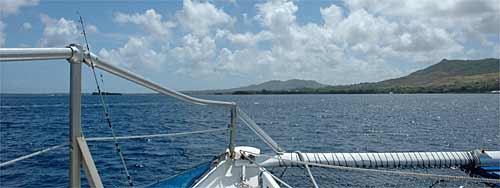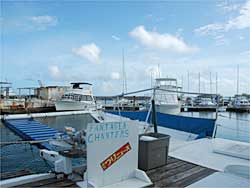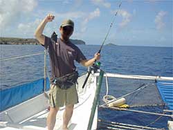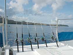 グアム島の南へ少し行ったところの港より、8時に出船しました。今回は、老夫婦が一組と若いご夫婦、そして私という5名だけの参加でした。キャプテン・ルイスとマックスがいろいろ指導してくれます。デッキには「週刊つりニュース」のステッカーがありますね。シュノーケリングもできて、ダイビングスポット近くで体験できます。