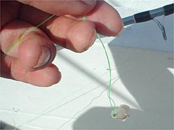 エサは、イカの切り身です。針に縫うように刺して針を隠します。何が釣れるのかよく分かりませんが、オモリが着底したら、1から3回巻き戻し棚をと選ります。