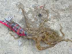 夜明けと共に復活しますが、10cmクラスが鈴なりに掛かるようになり、アオリ釣りに転進。なぜかイイダコ(?)一匹とアオリを3ハイ釣ったので、朝9時で今回の釣りを終了。