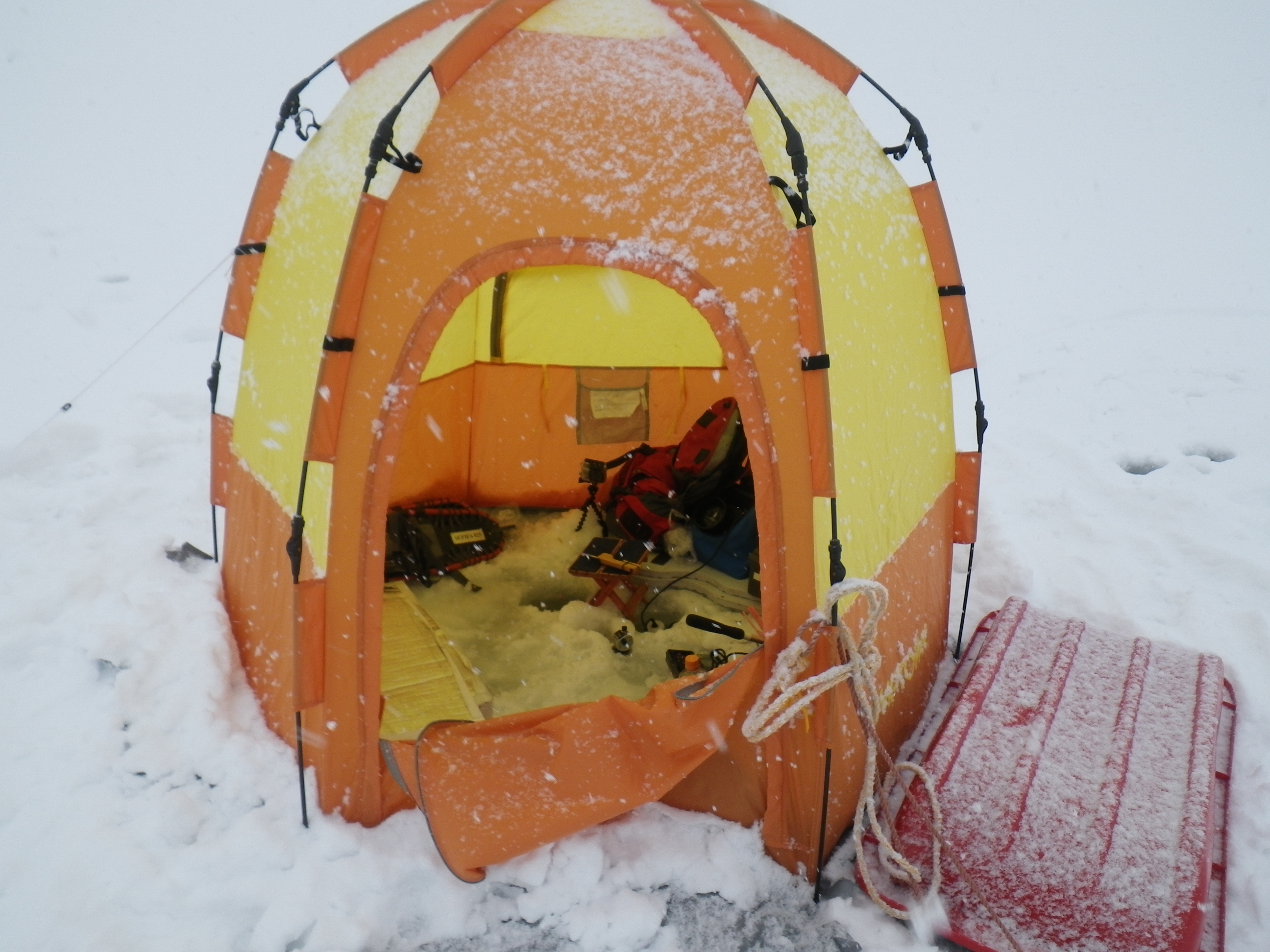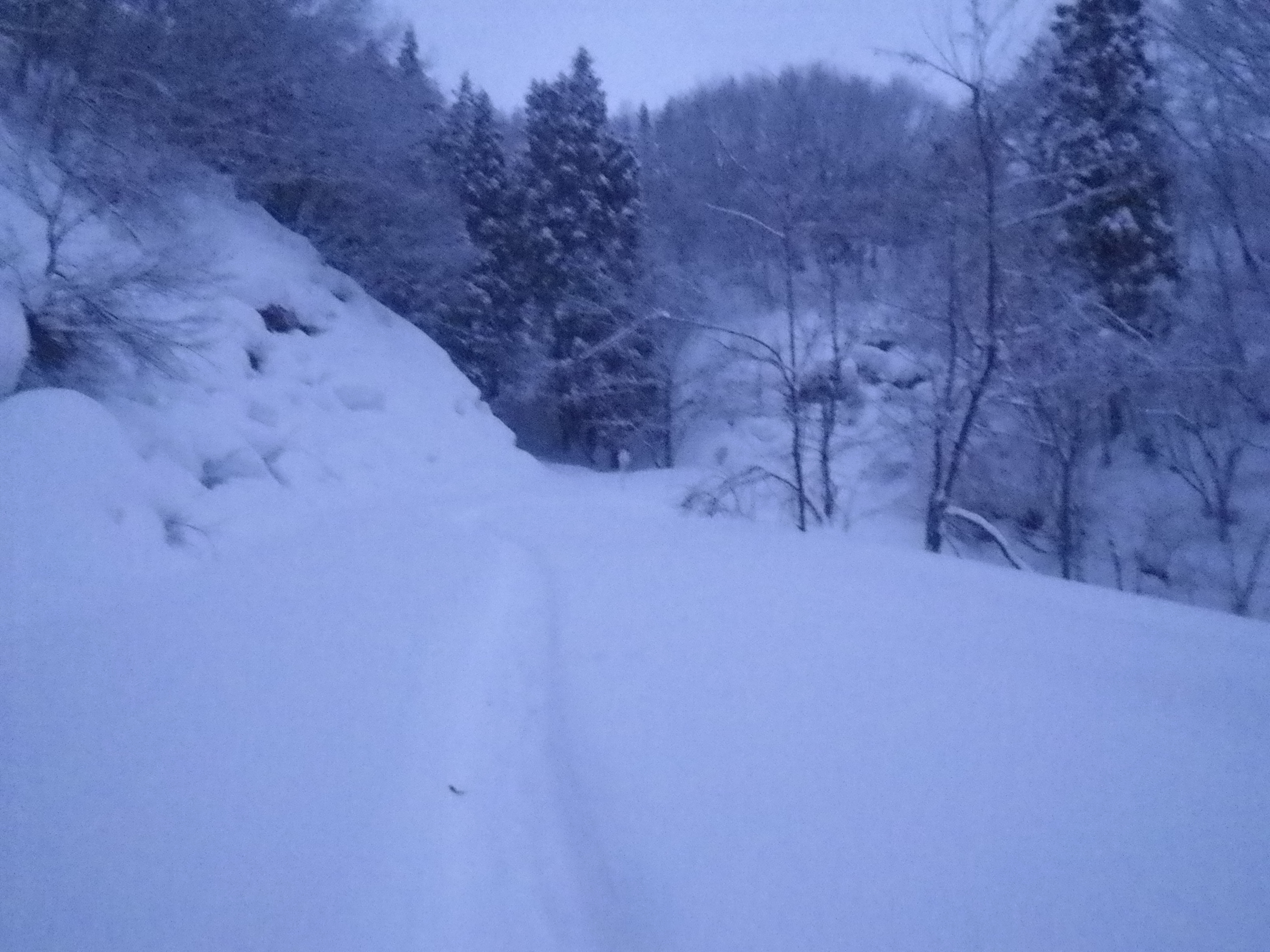 のんびり明るくなるのを待って、また釣り場まで歩きますが、今回は雪が降って吹雪くことが予想されるので